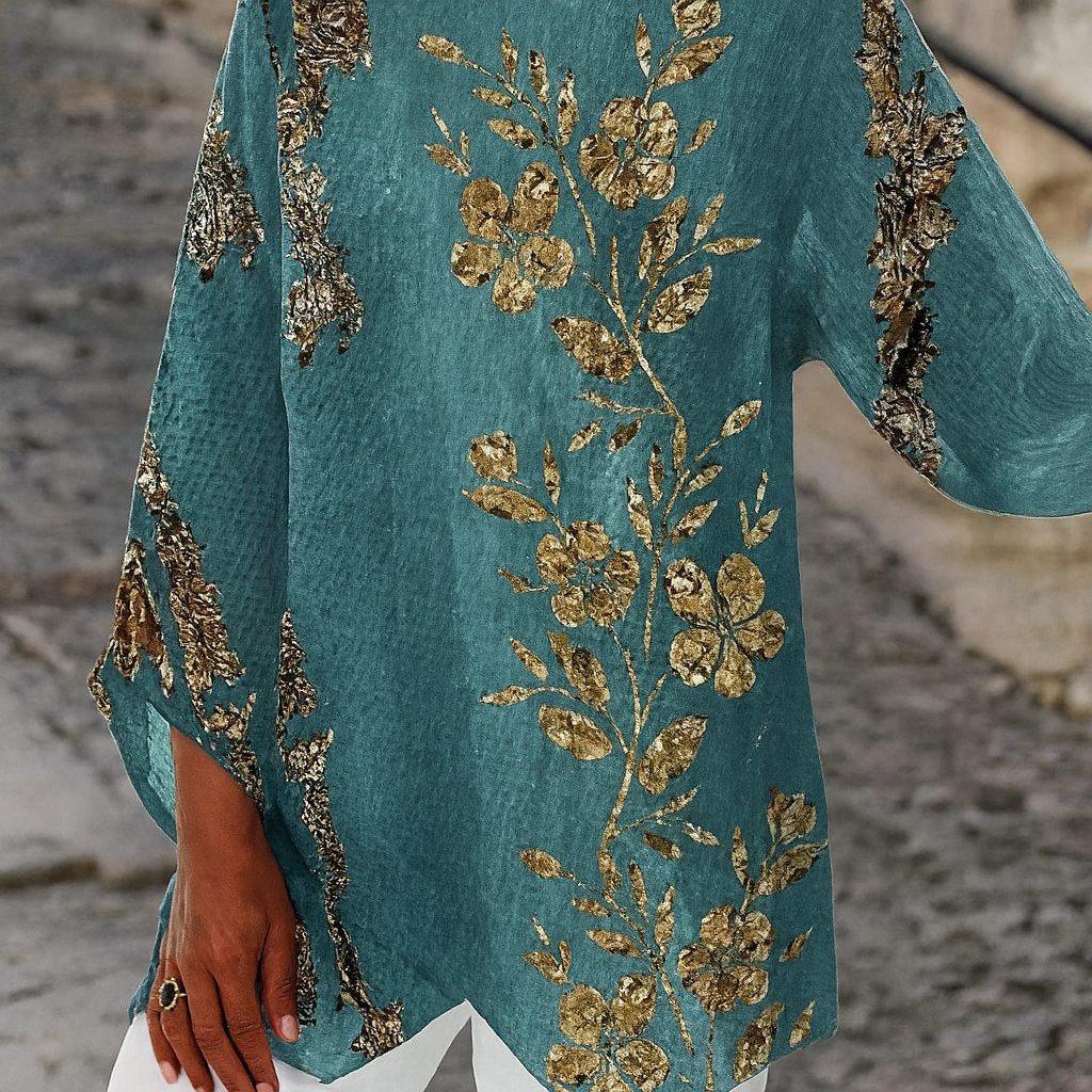 Gylden Blomstrete Langermet Bluse – Casual Eleganse med Feminint Kunstnerisk Uttrykk