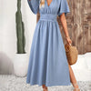Denne blå midi kjolen kombinerer tidløs eleganse med hverdagskomfort, noe som gjør den til et allsidig tillegg til garderoben din. Dens klassiske V-hals og korte ermer gir en flatterende silhuett som passer til ulike anledninger.