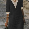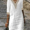 Denne kjolen i linblanding kombinerer komfort og eleganse, noe som gjør den til et allsidig tillegg til garderoben din. V-halsen prydet med delikat blondekant tilfører et preg av femininitet, mens den avslappede passformen og 3/4-ermer sikrer bevegelsesfrihet og pusteevne.