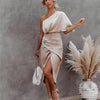 Kjolen er et tidløst tilskudd til garderoben din, som sømløst blander eleganse og sofistikering. Laget av luksuriøst satinmateriale, har denne midi-kjolen en en-skulder design og delikate volanger, noe som gjør den perfekt for cocktailfester, bryllup og andre spesielle anledninger.