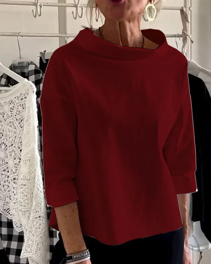 Chic, koselig og enkel å bruke — Miriam-toppen kombinerer komfort med sofistikert stil. Med en unik halv hals og brede reverser, hever denne toppen dine hverdagsantrekk med subtil eleganse og en flatterende passform.