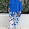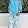 Angelique-settet er selve symbolet på uanstrengt eleganse, perfekt for varme dager og stilige utflukter. Med en luftig off-shoulder topp med brede lanterne-ermer og matchende vide bukser prydet med et retro abstrakt mønster, tilbyr dette antrekket både komfort og stil.